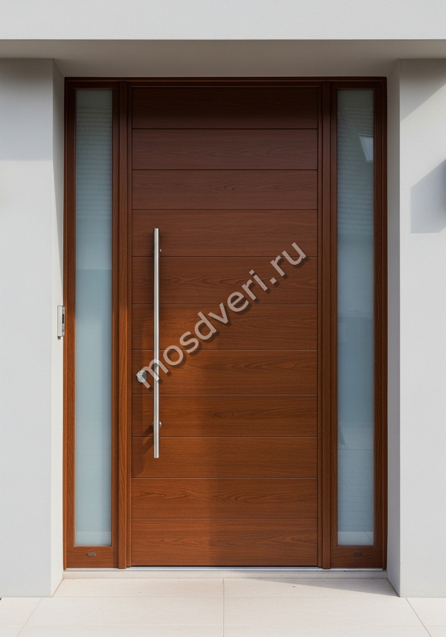 Высокая входная дверь в дом коричневая со стеклом c двух сторон — сочетает в себе эстетичность и максимальную защиту.